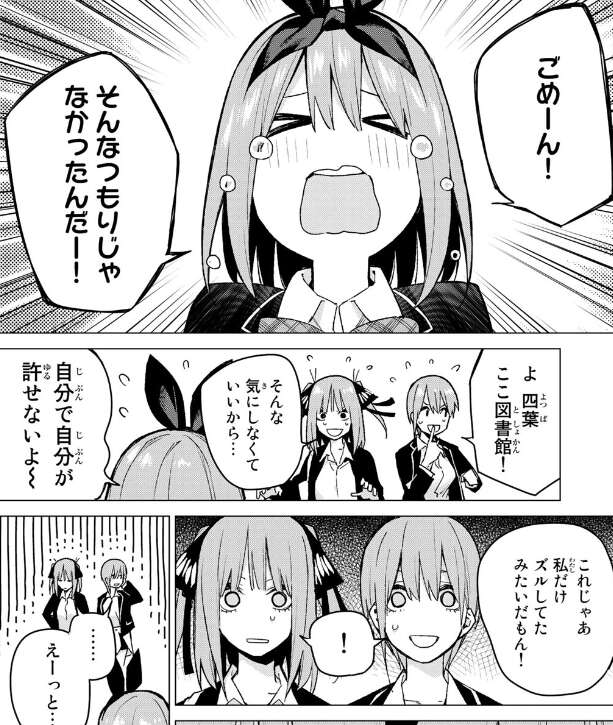 が、二乃からプレゼント中止だと指摘されるとそんなつもりじゃなかったんだー、と四葉は泣きながら謝り、自分だけズルしてたみたいだ、人として最低だー言います。人として最低と四葉に言われ、言葉が出ない一花と二乃です。