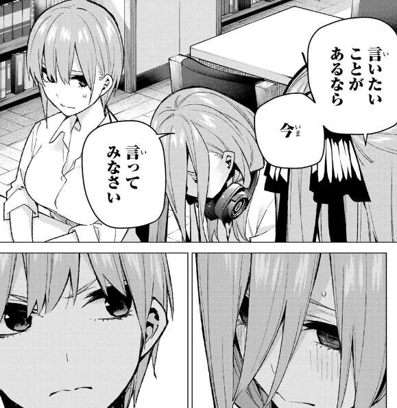 が、三玖は二乃のように全員の前で堂々と宣言できず、二乃から言ってみなさいと言われたところで、はっきりと言えず黙ってしまいます。二乃の大胆発言になのか、三玖への強気の態度へなのか、二乃を睨んでしまう一花です。