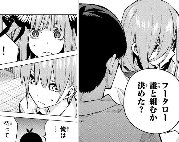 ここで二乃が、誰もそんなの望んでいないと言い別の提案をします。「私とフー君が二人っきりの班を組むの」と、なんと五人班を無視して二人で組む、風太郎に拒否権はないと言います。全員驚きますが、三玖はフー君呼びが特に気になったのか一人「フー君…?」と呟いています。