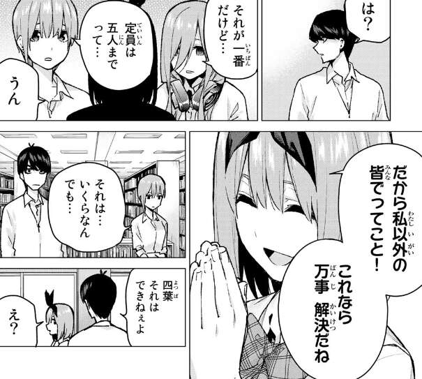 そして考え抜いた結論は、五つ子と風太郎の皆で同じ班になろうと言います。班が五人までなので無理だとみんな言いますが、四葉は自分が外れれば問題ない、万事解決だねと言います。風太郎は、それは出来ないと言いますが、四葉は何か問題ありますか?と返しあくまで自分が外れる事を引く気はありません。
