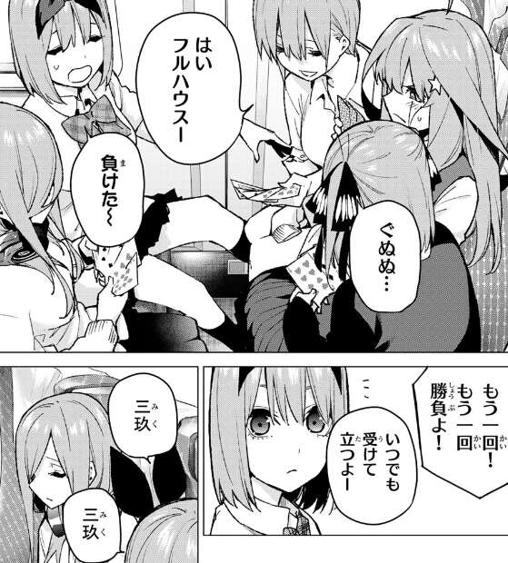 四葉に起こされ、ようやく起きる三玖です。どうやら朝早くから無理を言ってバイト先の厨房を借りて、初日のお昼にとっておきを風太郎に食べてもらうため、三玖はパンを作っていたようです。気合の入る三玖、そして一花、二乃、五月、次 勝った人はなんでも命令できるルールにして、トランプ勝負でメラメラやっています。