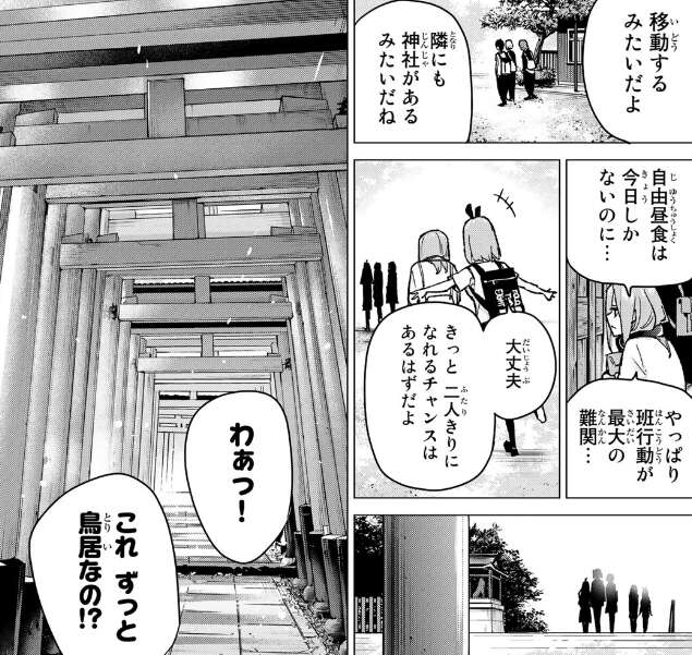 風太郎の班が出発すると、二乃の掛け声で全員ついて行きます。風太郎の班は、普通に京都の名所をまわっているようです。風太郎の班の移動に合わせて、五つ子たちも移動しつつ観光しています。三玖と四葉は、自由昼食で風太郎と二人きりになれるタイミングを探っています。