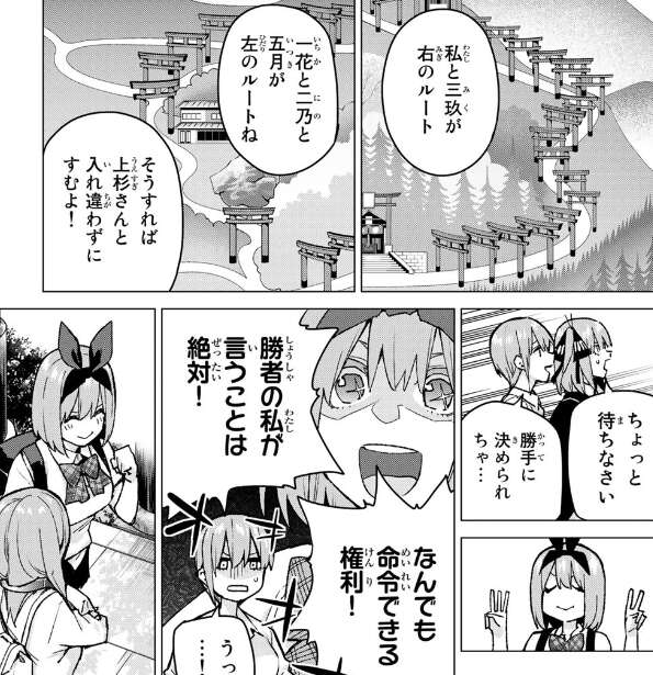 風太郎の班に追いつけないまま、五つ子たちはやっと四ツ辻に到着しました。ここから道が二つに分かれているようです。五月は早速、ここで何か食べたいと言い出しますが、三玖は自分のパンを考えると、ここでお昼をとるより風太郎の班を追いかけたいところです。そんな三玖に助け舟を出したのは四葉で、二手のルートに分かれようと提案します。一花と二乃は勝手に決めようとする四葉に抗議しますが、新幹線内でのトランプ勝負に勝利したのは四葉だったようで、勝者の権利を主張し二組に分かれることになります。