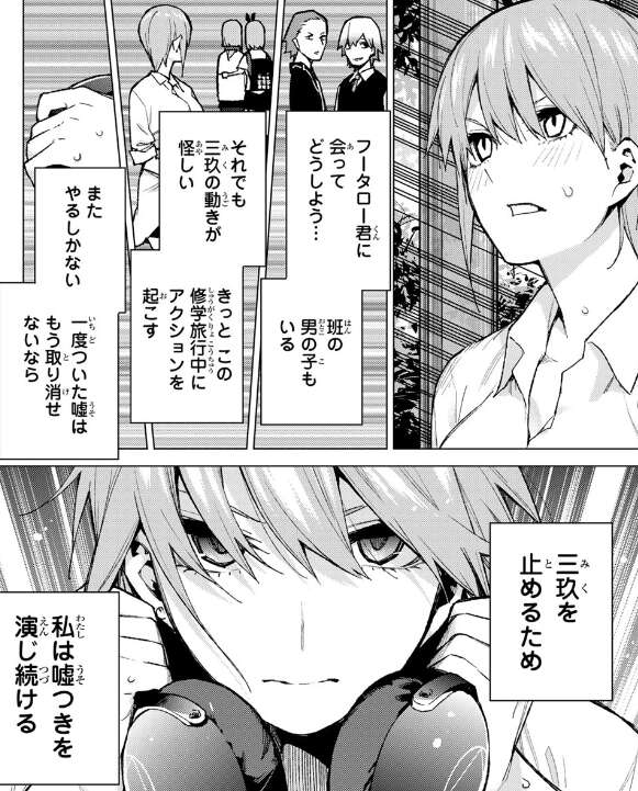 しかし、四葉はそんなつもりで言ったんじゃない、それが一花の本当にしたかったこと?と一花を責めます。四葉は三玖に、一花が邪魔をしようとしていると言い、ばらそうとしますが誰かが階段を上ってきている事に気付いた三玖一花は、四葉を止めようとします(追記:コメント欄で教えてもらいましたが、状況から見て三玖は階段を背にして登ってきている風太郎が見えない等の理由で、四葉を止めようとしたのは三玖ではなく、三玖に変装した一花の方のようです)。