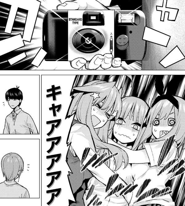 そこに再びシャッター音が鳴り、振り返ると誰かが二乃達を盗撮しています。思わず悲鳴を上げてしまう逃げ出す二乃、四葉、五月です。さらにその悲鳴を聞いた風太郎と一花は何があったのか、走って確認に来ますがそこで二人は鉢合わせになります。