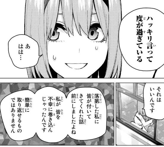 二乃達は部屋の扉の前で、三玖と一花に鍵を開けるように呼びかけますが、部屋の中に一花はおらず、三玖はひどい顔をしたまま無反応です。四葉もまだ修学旅行は二日あるので、これから自分に取り戻させて欲しいと語り掛けますが、四葉は何も悪くないと心の中で三玖は呟きます。
