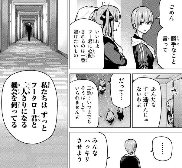 風太郎にはたいしたことないと言ってごまかしますが、このままでは誰も風太郎と二人きりになる機会が無くなってしまうと言います。五つ子たち、誰の目的も叶わなくなることは、望むところではないはずだと一花は言い、ある提案をします。