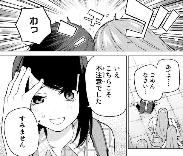 今週から新しい話が始まり、今週の内容から四葉絡みの話が中心となりそうです。まずは小学生の頃の京都での修学旅行で、風太郎が盗撮していると間違われましたが、その時の四葉視点での回想です。四葉は他の四人を探している時に、偶然風太郎を見つけていて盗撮騒動の一部始終も見ていたので、風太郎が無罪だと分かっていたようですね。