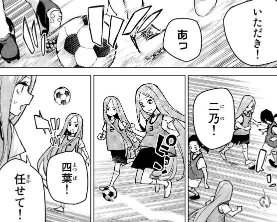 いざ試合が始まると、相手チームは五つ子のそっくりな外見に混乱して、さらに息のあったパスに翻弄されます。最後は四葉がパスを受けて、ゴールを決めます。試合も終わってみれば、3対1で勝利しています。試合後、四葉は監督から五つ子の中でも特に上手くなってきていると褒められます。