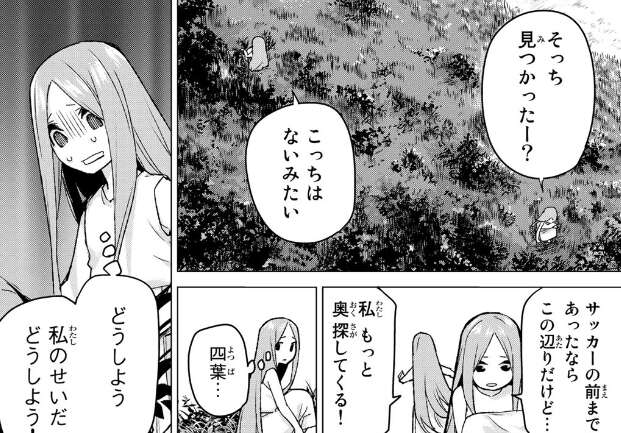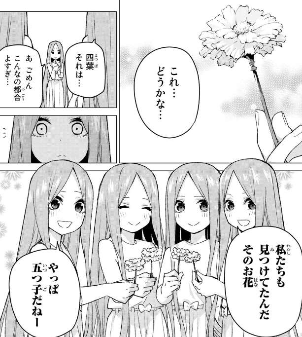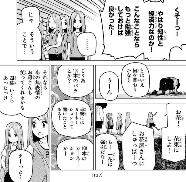 カーネーションを買おうかと話をしていますが、四葉がお財布を確認しようとするとお財布を落としている事に気付きます。五つ子たち全員でお財布を探しますが、どこにも見つからず四葉が落ち込んでいると、他の四人は失敗も五等分だからねと四葉は悪くないとフォローします。