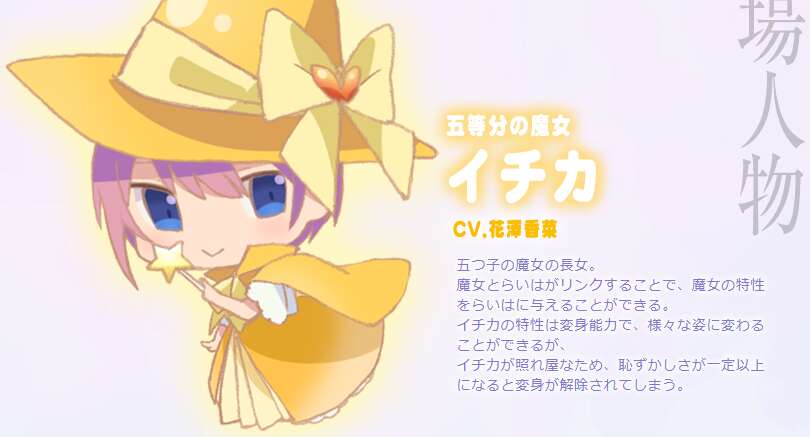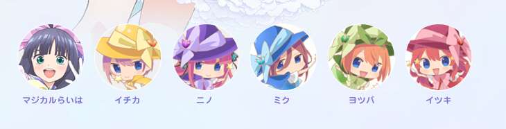 キャラ紹介から、主要キャラクターのマジカルらいは、イチカ、ニノ、ミク、ヨツバ、イツキです。
