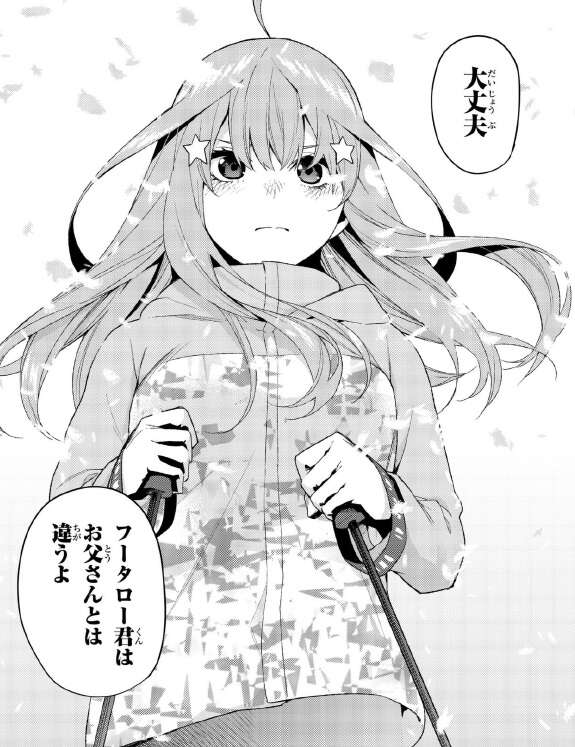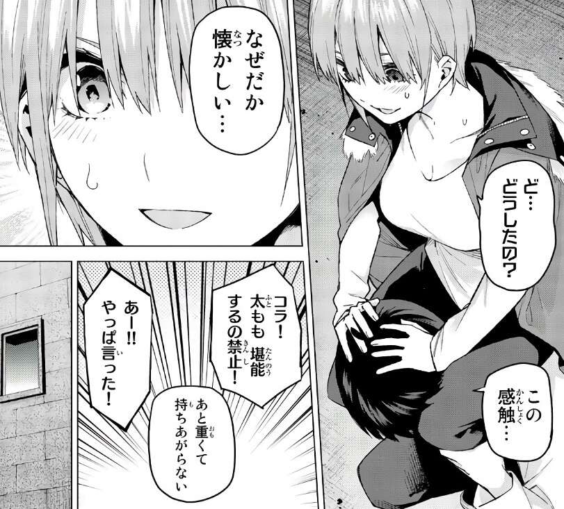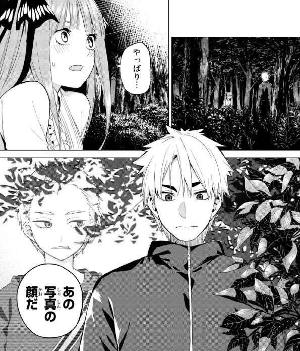 キャンプファイヤーの準備を手伝って丸太を運んでいると、小屋に一花と風太郎は閉じ込められてしまいます。焦る風太郎とどこか余裕の一花です。何とか外に出られないかと、風太郎は一花を肩車して、防犯センサーを作動させようとしますが一花の太ももが…。