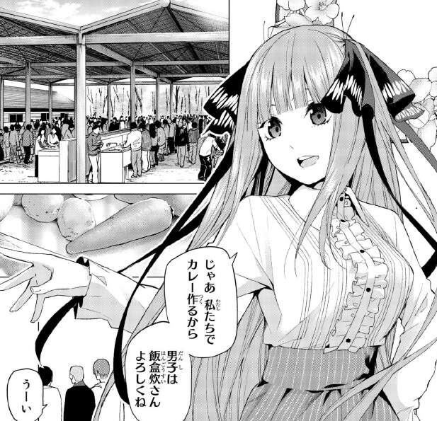 無事、林間学校に参加できた五つ子と風太郎です。五つ子達はそれぞれの班でご飯作りをしていますが、それぞれ個性が強すぎます。二乃はチームのまとめ役として、活躍します。