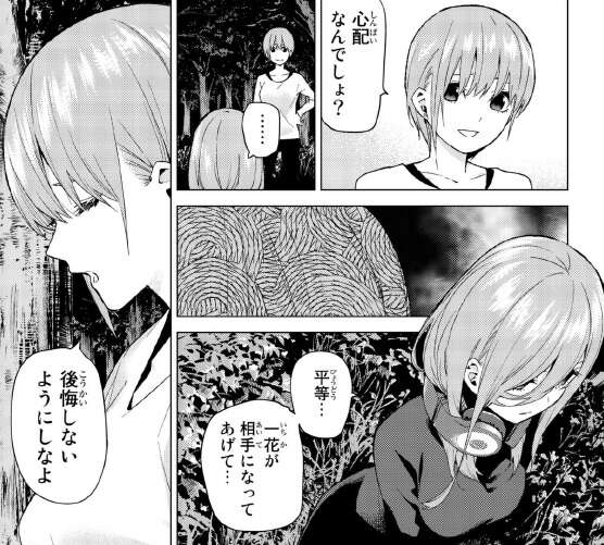 一花は三玖から最終日のダンスの相手になって欲しいと言われていますが、三玖の望みをくんで最終日のダンスの相手を変わろうと提案します。しかし、三玖は頑なに平等を主張して一花にダンスの相手を譲ろうとします。そんな中、キャンプファイヤーの準備の手伝いで丸太を四葉と運びます。
