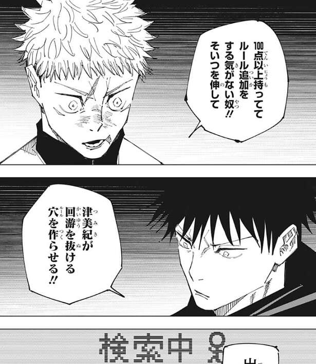 伏黒は“プレイヤー間でのポイントの譲渡を可能にする”というルールを追加する事で、身内でポイントを回し続ければ、術式を剥奪されて死ぬことはなくなる、と考えます。これで津美紀は殺し合いに参加しなくてもよくなります。さらに伏黒は、出来ればルール追加はもう1つ、“ポイントを消費して死滅回游から離脱できる”というルールを追加したいと考えます。それは例の“永続”に抵触するんじゃねぇか?と、秤は指摘しますが、伏黒も同じ考えのようです。それでも、非プレイヤーを死滅回游に引き込む身代わり条件をルールに盛り込めば、ルール追加出来るのでは?と、伏黒は考えます。