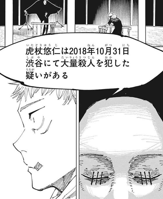 すると、ジャッジマンは虎杖が渋谷事変で大量殺人を犯した疑いがある、と虎杖に罪状を言い渡します。