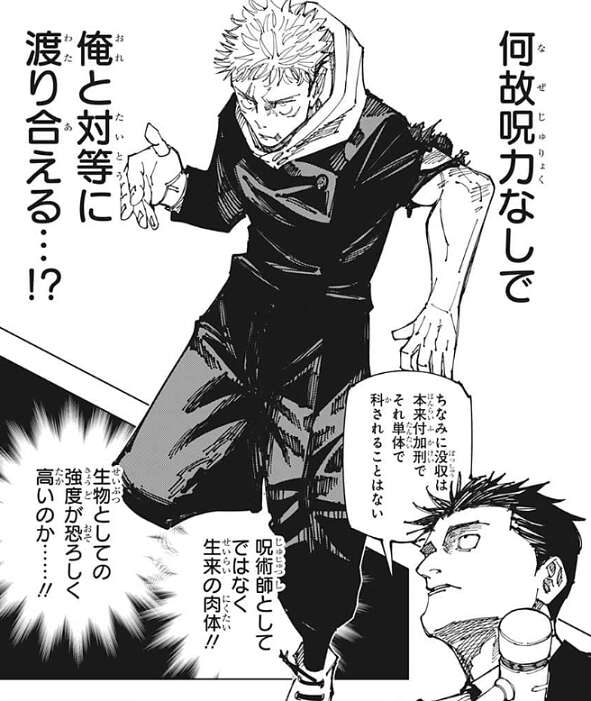 日車は虎杖と話しつつ、虎杖が呪力なしで自分と対等に渡り合えている事に驚愕します。虎杖が呪術師としてではなく生来の肉体、生物としての強度が恐ろしく高いことに日車は気付きます。また術師は術式が使用できなくなると、長年の勘が鈍るのか基礎的な呪力操作もグダグダになることが多かったようですが、虎杖がそれより不利な、完全な呪力の使用不可の状態で、これだけ自分と戦えている事実に脅威を感じ、日車は虎杖を全力で潰す決意をします。
