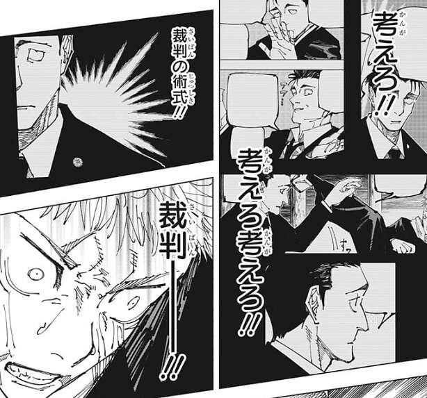 虎杖は日車の術式が裁判の術式なのに気付き、裁判のルールを利用して日車にある提案をします。