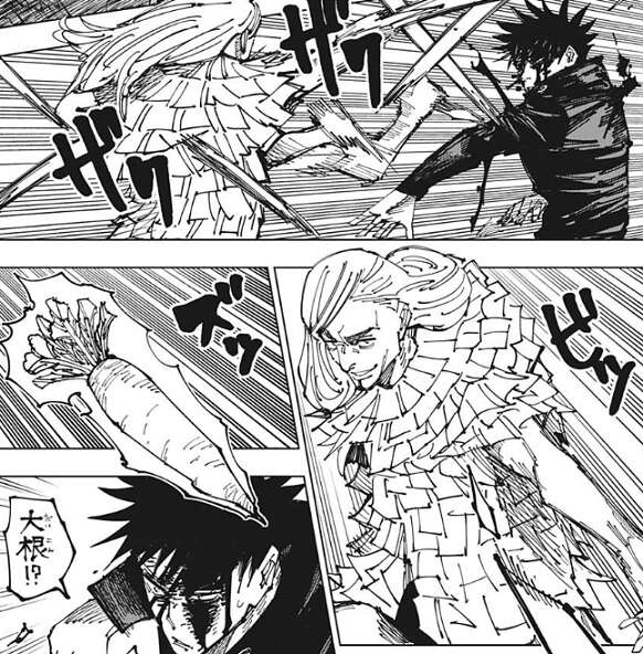 伏黒がレジィの攻撃で傷を負いますが、レジィはさらに大根を再契象して呼び出します。伏黒は突然現れた大根に困惑しますが、大根の中から包丁が飛び出し伏黒の体に突き刺さります。どうやらレジィが再契象で再現したものは式神のような物なので、簡単な命令を与えることが出来るようです。レジィは伏黒の性格的に無駄だと思うけど…、と前置きしつつ、持ち点くれたら楽に殺してあげるけど?と、伏黒に持ち点を渡すように言います。