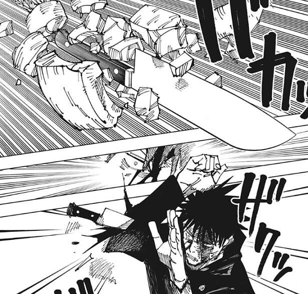 脱兎はネットに捕まりますが、伏黒はネットをかわしてレジィと再び対峙します。するとレジィはレシートを数枚取り出し、術式「再契象」を使用するとレシートは刃物に変わり、伏黒や襲い掛かります。伏黒は刃物を武器で撃ち落とし、他の刃物は脱兎で防ぎます。