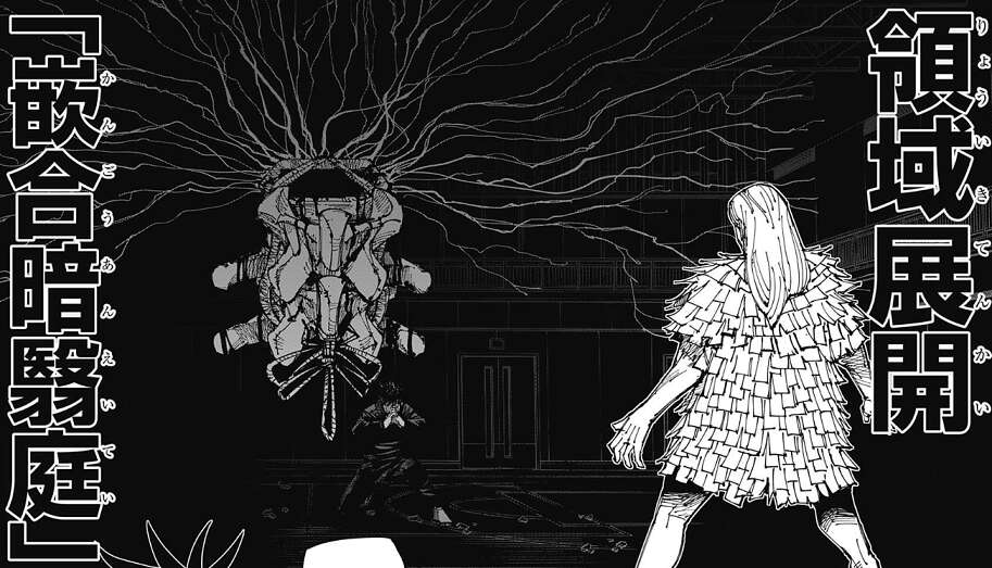 伏黒が領域展開「嵌合暗翳庭」を使うと、レジィは驚愕の表情を浮かべます。俺は別に大技がないとは言ってねぇよ、と嘘は言っていないと伏黒はレジィに語りかけます。