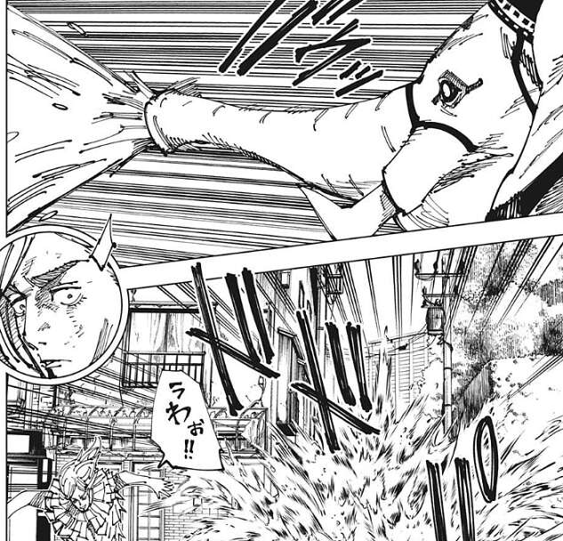 伏黒は何とか体を寝そべるような状態にして、大型トラックをかわします。二台の大型トラックは体育館の壁に激突しますが、レジィはさらに植木鉢を伏黒の上空に再契象して呼び出し、伏黒に頭にぶつけます。そしてレジィ自身は武器をつかって伏黒を攻撃します。