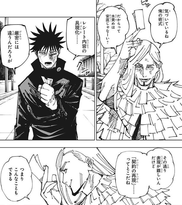 レジィは伏黒が満象で水責めを織り交ぜてきたことから、伏黒が自分の術式に気付いていると推測し、カマをかけます。レシート内容の具現化…、厳密には違うんだろうが、と伏黒は表現しますが、レジィは、「契約の再現」ってところだね、と答え再び、レシートを燃やして術式「再契象」を使用します。