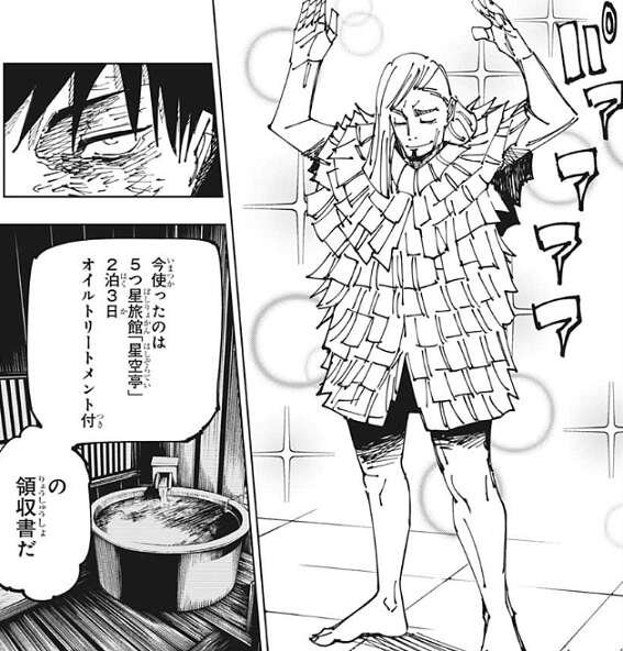 満象でレジィを水責めにしようとしますが、レジィは満象の放水を避け、さらに襲い掛かってくる伏黒にレシートを投げつけます。伏黒は多数の脱兎の群れと共にレジィを攻撃しようとしますが、レシートから変わったネットが伏黒と脱兎を捕らえようとします。