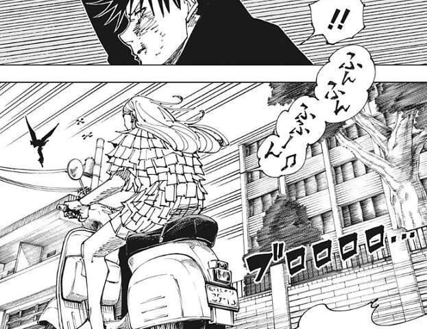 それに比べて伏黒は先の戦闘で負傷、複数の式神の併用でヘロヘロだとレジィは言い、一度傷つけられた式神は出したり消したりは出来ないから、走・攻・守揃った犬を今は出せない、そのせいで一芸の式神を併用せざるを得なくなってる、とレジィは伏黒に指摘します。お互い出力の高い大技を持たない消耗戦だから、伏黒ではレジィは殺せない、とレジィが更に指摘すると、伏黒は逃げると言うと鵺を呼び出して、飛んで逃走しようとします。