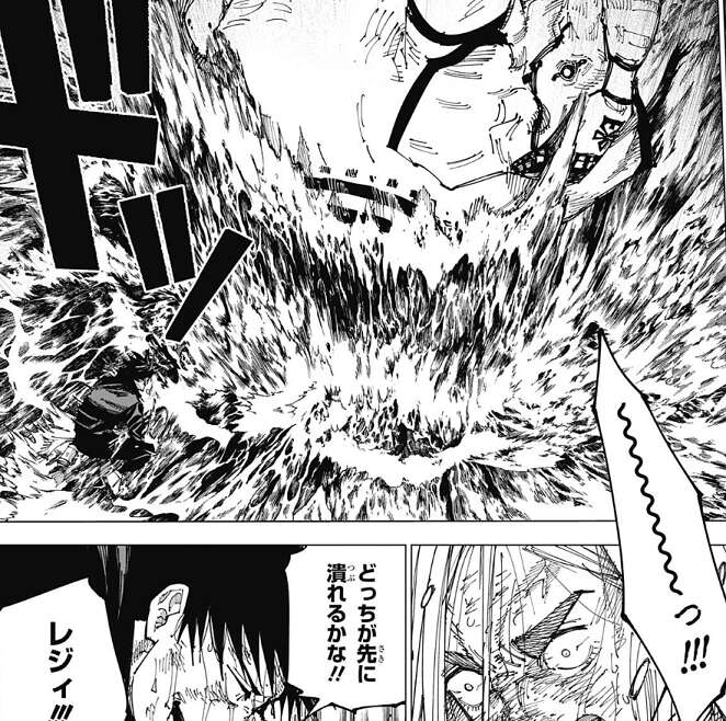 上も影だ!!と、伏黒が言うと天井の影から満象が出現、レジィの所に落ちてきます。レジィも満象の重さを引き受けることになり、レジィと伏黒の重量の我慢比べが始まります。