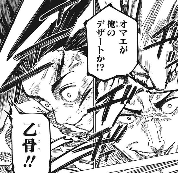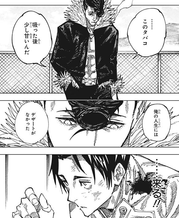 もう少しコンパクトに戦ってください、という乙骨の言葉に石流は反論し、俺の一度目の人生は“腹八分目”ってところだった、と自分が戦う理由を乙骨に話します。そして、俺の人生にはデザートがなかった、と石流は言うと、突然乙骨に襲い掛かります。