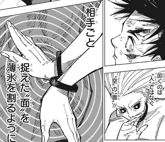烏鷺は乙骨の背中に両手を合わせて、捉えた“面”を薄氷を割るように叩きます。