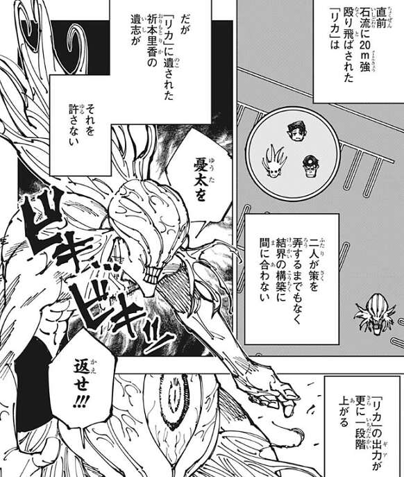 三人が同時に領域展開を行いますが、領域の押し合いの最中はそれぞれの必中術式は打ち消し合います。その間に「リカ」に邪魔されないように、「リカ」を結界内に入れない、という石流と烏鷺の利害が一致します。ただ「リカ」は直前に石流に20m強殴り飛ばされているため、結界の構築には間に合いません。しかし「リカ」に残された折本里香の遺志がそれを許さず、憂太を返せ、と「リカ」は言うとギアを更に一段上げて結界内に強引に入ろうとします。