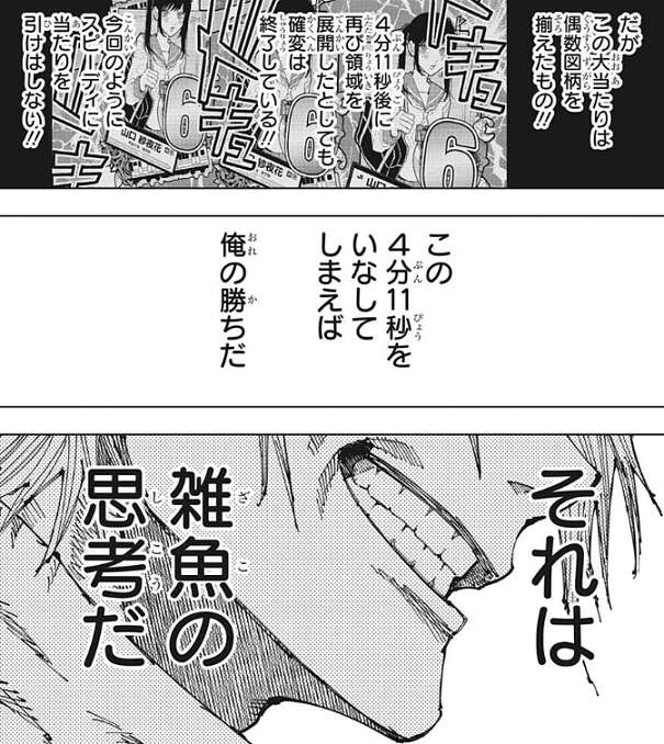 シャルルの時と同様、鹿紫雲一の脳内にも秤の領域と術式のルールが流れます。秤の領域は必中効果が無害なため、押し合いに強く術式の発動も早く、そのスピードは渋谷での真人をも凌ぎます。鹿紫雲一は「彌虚葛籠(いやこつづら)」の発動を諦めるよりも速く、「坐殺博徒」のルールを理解させられます。鹿紫雲一は秤の領域と術式のルールを理解すると同時に、さっきまでの秤は大当たりによって呪力のリミッターが無くなっていた事、領域の状況が前回(シャルルの時)から引き継がれている事なども理解させられます。