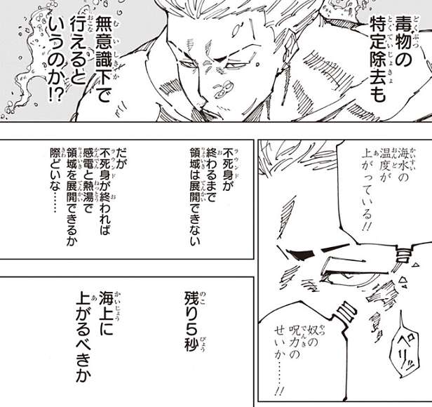 秤の反転術式はフルオートですが、どうやら毒物の特定除去も無意識化で行えるようで、塩素ガスの特定除去を秤は無意識に行い、意識を回復したようです。秤は海水の温度が上がっている事に気付き、鹿紫雲一の電気の呪力のせいだと断定します。秤の顔の皮膚にも影響が出始めていて、このまま海中にいてラウンドが終われば、感電と熱湯の影響で再び秤が領域を展開できるか際どいと考えます。ラウンド終了まで残り5秒、海上に上がるべきか秤は一瞬考えます。