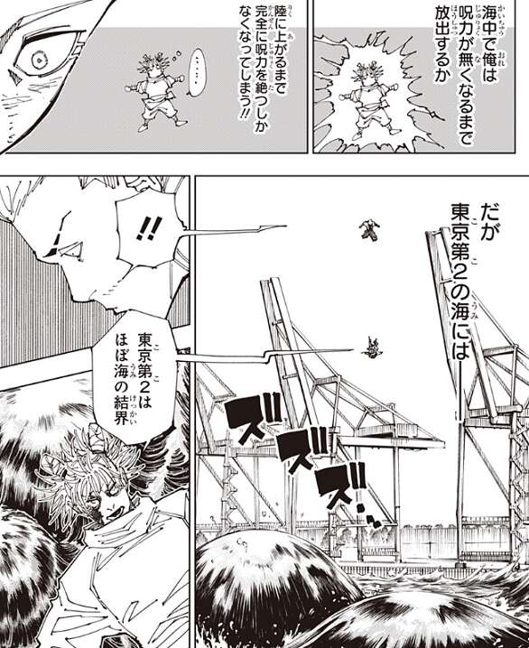 鹿紫雲一は電気と同質の呪力なので、海中に一度落とされれば空になるまで呪力が止まりません。その為、海中で呪力が無くなるまで放出するか、陸に上がるまで完全に呪力を絶つしか、鹿紫雲一は手段が無くなってしまいます。しかし、東京第2コロニーはほぼ海の結界で、海の中から呪霊が何匹も出てきます。