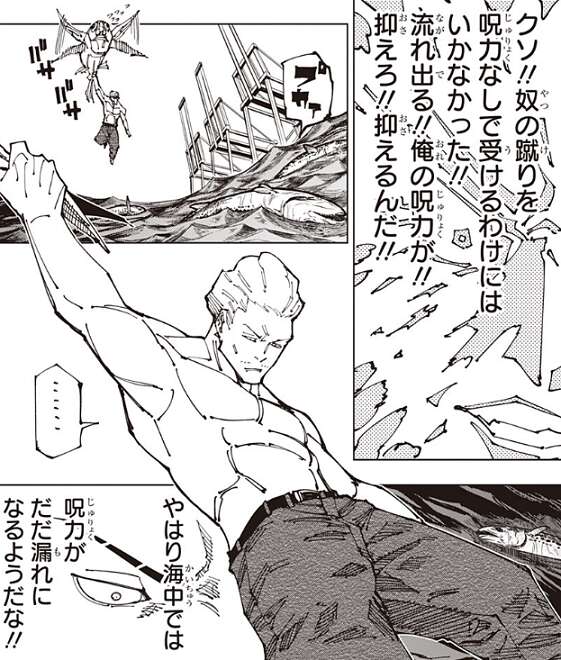 秤の蹴りを呪力なしで受けるわけにはいかなかった鹿紫雲一は、呪力を出したまま海中に落下してしまい、呪力が流れ続けてしまいます。鹿紫雲一は呪力を抑えようとしますが、海の上では秤が呪霊に捕まって鹿紫雲一を待ち構えています。秤は上がってこようとする鹿紫雲一を、呪力が空になるまで海中に落とし続けようと考えます。