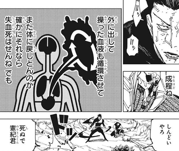 直哉は、加茂憲紀が外に出して操った血液も循環させて、また体に戻している事に気付き、これなら失血死はしないと納得します。それでも加茂憲倫はかなりしんどいはずで、しんどいやろ、死ぬで憲紀君、と直哉は加茂憲紀に話しかけます。加茂憲倫は直哉には答えず、真希にいったん外に出るように言います。