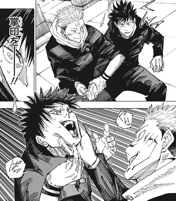 しかし、宿儺は一瞬で距離を詰めると伏黒の手を取って掌印を結ばせないようにし、強引に伏黒の口を開かせます。そして、宿儺はちぎり取った指を伏黒の口に入れて、強引に飲み込ませます。