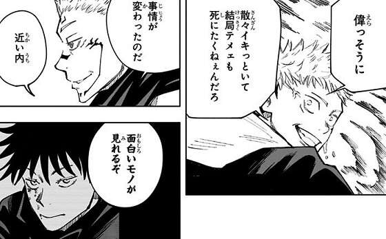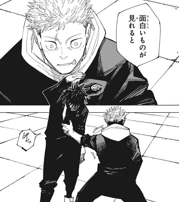 宿儺は伏黒に受肉すると、虎杖の体は虎杖本人へと戻ります。伏黒の体に受肉した宿儺は、覚えているか?面白いものが見れると言ったろう、と虎杖に話しかけます。