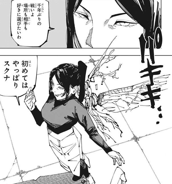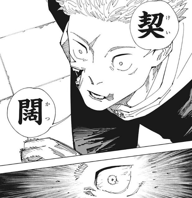 虎杖と来栖は万を追いかけようとしますが、ここで宿儺が、契闊、と唱えます。宿儺は2巻 第11話で虎杖と結んだ縛りを使います。宿儺が「契闊」と唱えたら、一分間体を明け渡す契約で、このタイミングで宿儺が虎杖の体に現れます。