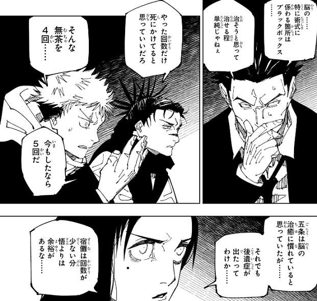 脳を自ら破壊して反転術式で治癒するのはかなりの無茶で、五条はそんな無茶を5回もしていた事になります。家入は、五条は脳の治癒に慣れていると思っていた、と言いますが、それでも五条には後遺症が出てしまいました。ここで、五条は脳の治癒に慣れていると思っていた、と家入が言っている根拠は、過去編で伏黒甚爾に頭を刺された時、五条が反転術式で治癒出来た事が理由のようです。宿儺は焼き切れた生得術式を修復した回数が少ない分余裕があるようですが、五条は仮に領域を展開しようとするとその時点で死んでしまうか、宿儺に対抗できるほどの精度は出せないようです。
