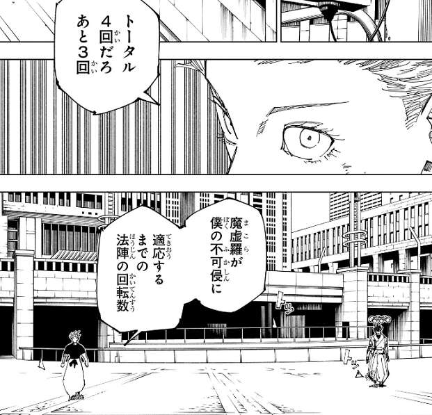 「無量空処」に対しては5回目で適応を終えていたので、五条の「無下限呪術」から生まれる技に対して適応するには、魔虚羅とはいえ複数回の法陣の回転が必要になる、と高専のメンバーは推測します。もはや、この2人に関してはあり得ないことが普通になっています。