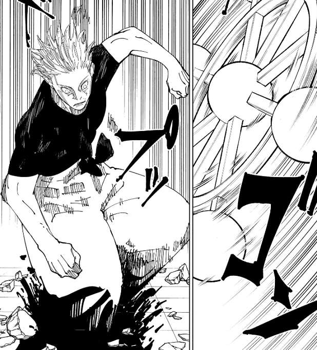 宿儺は術式順転「蒼」の攻撃を全て避けますが、五条は宿儺に近づき蹴りをくらわせます。宿儺はダメージを負いますが、致命傷を与える事は出来ません。