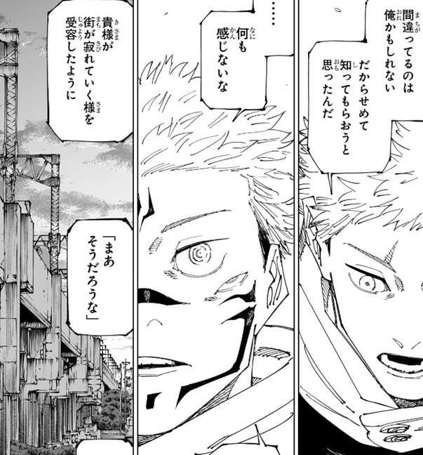 間違っているのは自分かもしれないので、せめて知ってもらおうと虎杖は今まで宿儺に子供の頃の思い出を見せてきたと話します。宿儺は虎杖の言っている事は全て理解できると言った上で、なんの感情も湧かないと答えます。