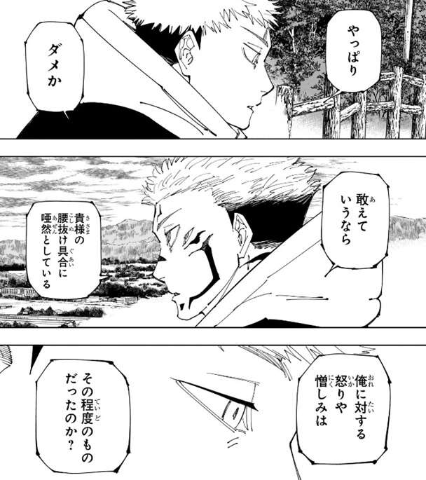 なんの感情も湧かないと言う宿儺に、やっぱりダメかとつぶやく虎杖。さらに宿儺は虎杖の腰抜け具合に唖然としていると言います。虎杖は宿儺に対して渋谷での大量虐殺や伏黒の身体を乗っ取った事に関して、激しい怒りや憎しみを持っていたはずですが、今回の虎杖の怒りや憎しみが消えたような態度に唖然としているようです。