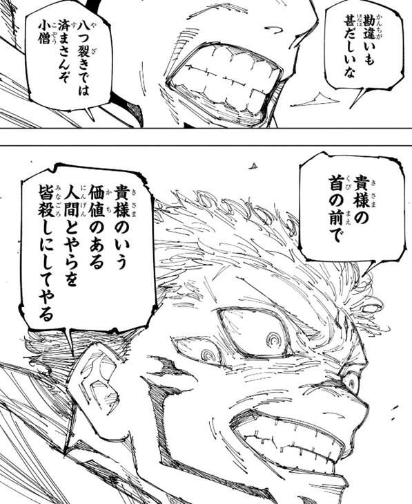 宿儺は八つ裂きでは済まさんぞと言い、虎杖がいう価値のある人間を皆殺しにしてやる、と虎杖に言います。