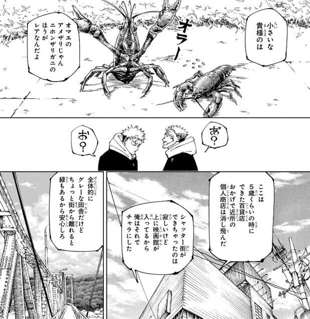 家から遠い方の公園では、虎杖は宿儺とザリガニ釣りをします。宿儺はアメリカザリガニを釣り、虎杖は二ホンザリガニを釣ります。宿儺は自分の方が大きいと言い、虎杖は二ホンザリガニの方がレアだとお互い張り合います。さらに虎杖と宿儺は百貨店に行ったり、田んぼを見て回ったりします。宿儺は虎杖に何か言いたげですが、虎杖はまだ行きたい所があると言います。