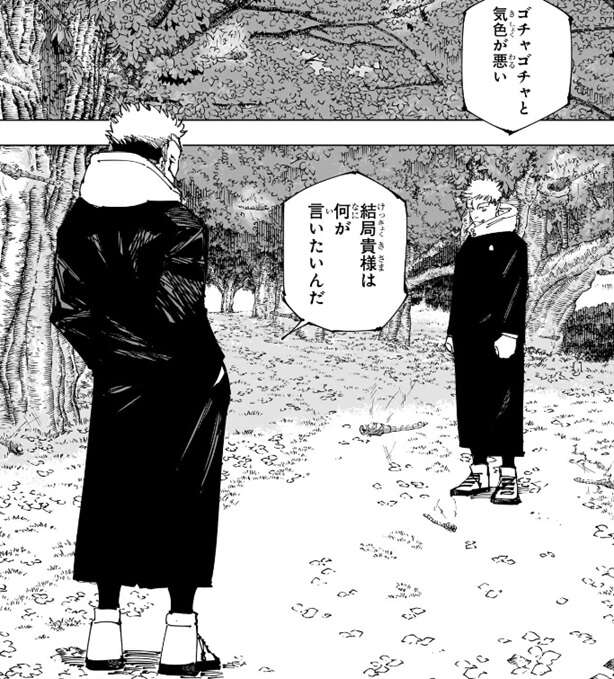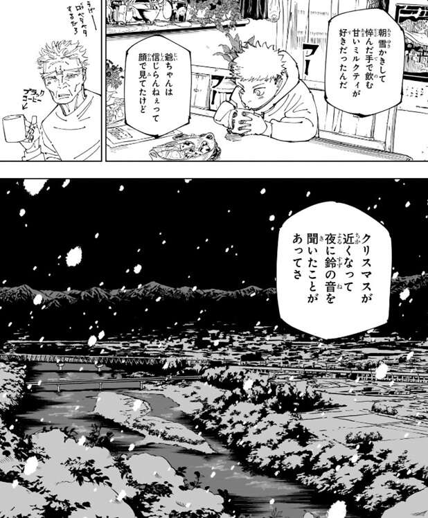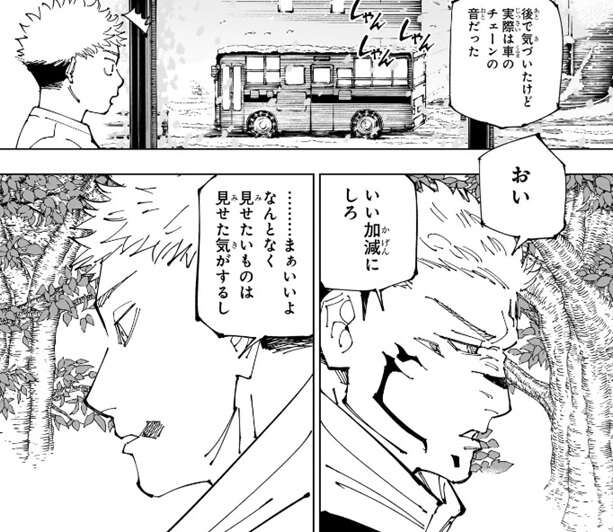 虎杖は6、7歳で仙台に戻るまで岩手県の北上駅の辺りに住んでいたようで、虎杖のお爺さんの仕事の関係だと理由を宿儺に説明します。少し前にお爺さんの友達の葬式で10年近く振りくらいにこの場所に戻ってきて、結構寂れていてびっくりした、いや……びっくりはしてない、正直まあそうなんだろうなという感じで感情は動かなかった、と虎杖はその時の心情を宿儺に話します。さらに虎杖は一番よく遊んだ公園を案内し、宿儺にその当時の事を色々話します。