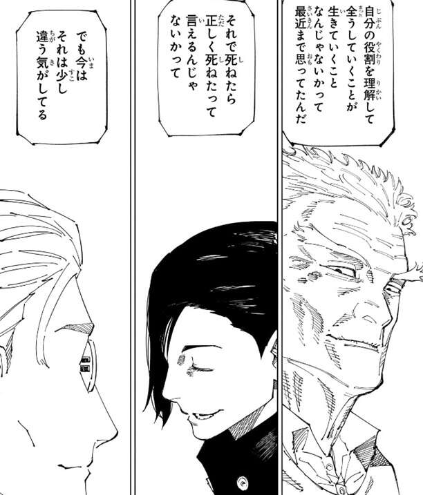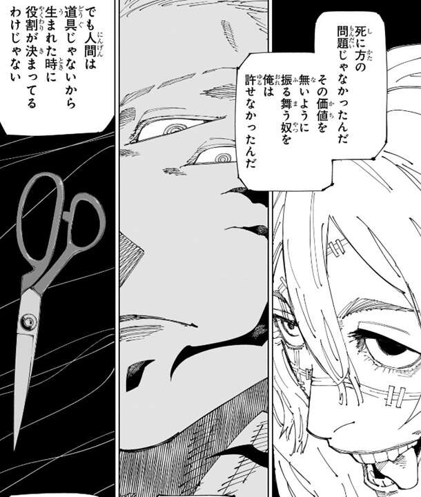 虎杖は自分が考える生き方、正しい死に方、人の命の価値等、自分の考え方を宿儺に話します。